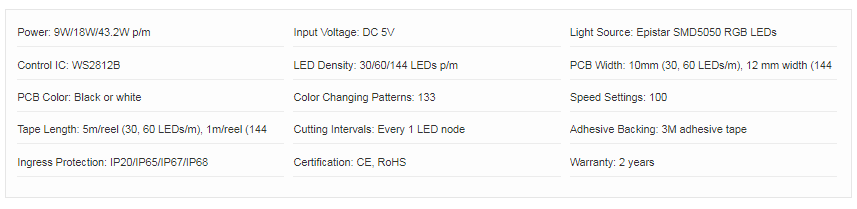 - WS2812B Individually addressable RGB LEDs (30, 60, or 144 LEDs per meter).