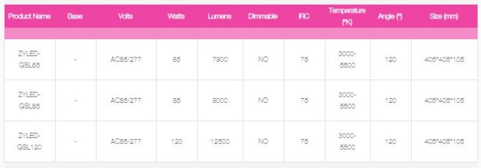 Dimmable: No. Base. Volts: AC85-277. Watts: 85. Lumens: 9000. IRC: 75. Temperature (ºK) : 3000-5500. Angle (º) : 120. Size (MM) : 405*405*105. Certification: UL.
