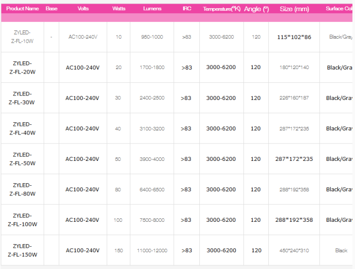 Volts AC100-240V. Watts 150W. Lumens 11000-12000. IRC >83. Temperature (ºK) 3000-6200. Angle (º) 120. Size (mm) 450*240*310. Cover Type BLACK/GRAY. Certification UL, CE.
