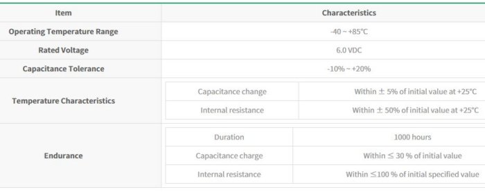 Module Type Standard Series: Endurance : 6.0V 65? 1000 Hours, Small size, high capcaitance and low resistance, Longer cycle life than other secondary batteries.