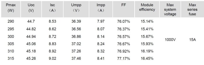 (0,+5W) 100% plus tolerance.3 times of 100% EL.25 years Linear performance warranty.ZO years Irrevocable warranty insurance.5400P a snow load and 2400P a wind load. High performance in low solar irradiation.Resistance to ammonia & salt mist corrosion