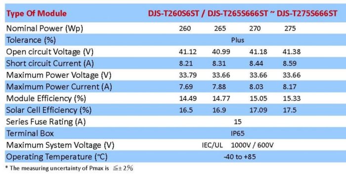 DJS - Model T260W Series (6x 11 66 Cell) - (ETL) -Mono-Crystalline Photovoltaic Solar Module
