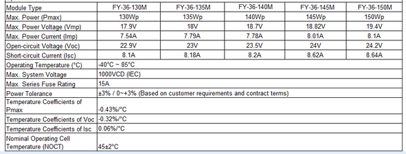 Feiya - Model 130-150W -Monocrystalline Solar Panel
