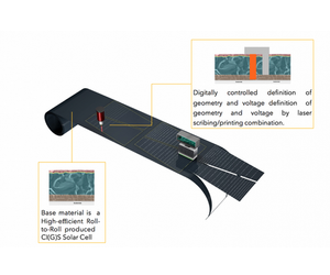 The optical and electrical characteristics of the different thin-film layers allow a selective ablation and cutting by a short-pulse laser. First the module design is applied by laser processes. It means the generation of microgrooves for integrated cell interconnection, edge deletion and fiducials for further processing. Secondly, the cell interconnection (including a dielectric barrier) is printed into the microgrooves. This approach enables the production of bespoke solar modules digitally controlled via a software interface.