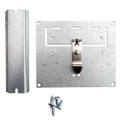 Mounting bracket for carrying rail 35/7,5. Place the mounting plate on the backside of the enclosure with the springloaded clamp facing downwards. Fasten the mounting plate using the four attached screws ø4.8x13, see figure 1 location “A”.