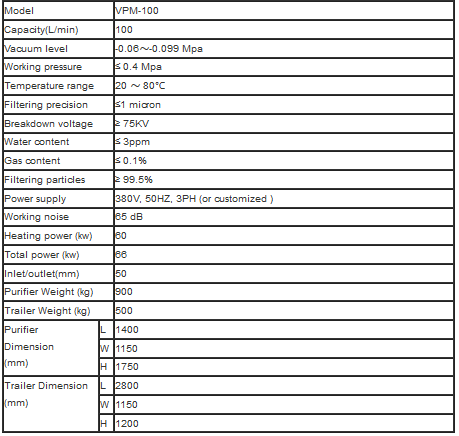 VPM Moveable Vacuum Transformer Oil Purifier is developed for transformer oil degasification, dehydration and filtration processing on site at outside.Being able to remove water and gas fast and effectively under high vacuum and high speed operation status,drying the insulating oil very well, improve the breakdown voltage up to 70 KV quickly. Have a big improvement on the one time purification result,reduce the dangerous of oil aging caused by repeat heating on the ordinary oil purifier