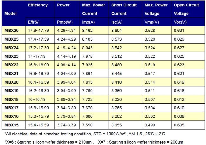 Dimension 156 mm x 156 mm +/- 0.5 mm.Thickness (Part number) Starting silicon wafer: 200 +/- 30 um.Reference final cell thickness: 220+/-30 um.Front Side(-) Blue anti-reflecting coating (silicon nitride) 1.5 mm wide bus bar (silver) x 3.Back Side(+) Back surface field (aluminum) 3.0 mm wide bus bar (silver/aluminum) x 3