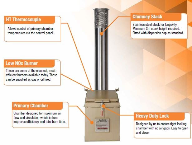* - The burn rates provided are to be used as a guide. We have based these figures on test burns using Medical Waste (lowest burn rate) to Cat. A&B Wood (Maximum Burn rate). Burn rates are also dependent on the calorific value of waste, fuel quality and local atmospheric conditions.