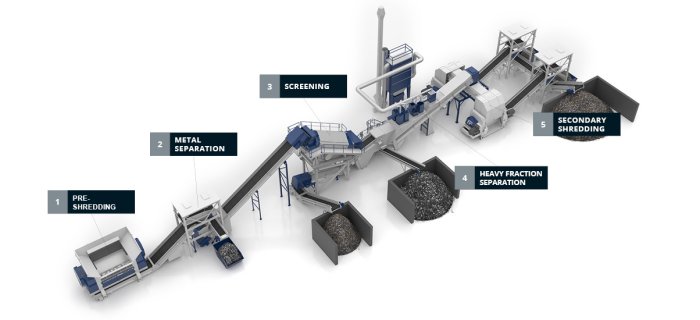The process starts with untreated waste from households, commerce and industries being fed – often via wheel loaders, diggers or dosing conveyors – into the primary shredder. The aim is to obtain homogeneous, sortable material ready for the next step in the process.