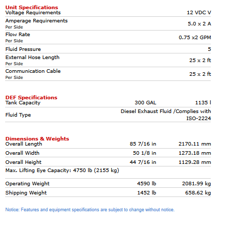 - Internal 300 Gallons (1135 liters) DEF Tank, Poly.