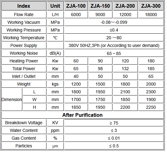 The cleanliness of the filtered oil product is above NAS1638-3, the water content is lower than 3PPM, the gas content is lower than 0.01% (methane and hydrogen Harmful gases such as acetylene are zero), and the breakdown voltage of oil products is greater than 75KV, all oil index fully meet the international UHV requirements. This machine also has the functions of vacuum drying, vacuum oil injection, and hot oil circulation. It can also be used as a separate vacuum pumping unit to the transformer and power equipment.