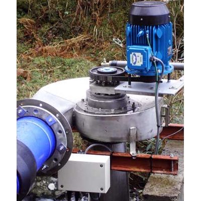 The Nautilus CMC Medium Head (CMC-MH) style turbine has been produced in the U.S. since the early 1900’s. This simple regulated Francis turbine is designed for heads of 3m to 12m and develops a maximum electrical output from 1,900 watts to 9.2 kw, depending on available head.