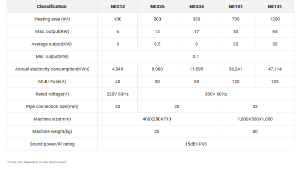 The main heating device is guaranteed for life free of charge. Trustfully long-term usage. Model NE131 can heats a 1,200m³ space with a 0.5m³ installation space, which can be installed in the nearest place to the heating space.