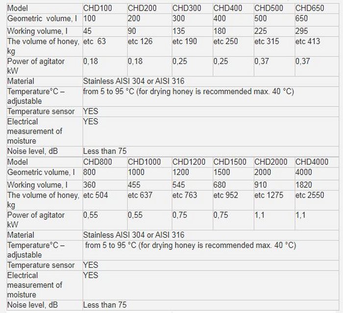 For more effective drying may dryer have heating in jacket Special stirrer with circular disc rotates, which ensures maximum heat transfer. Special squeegee located between the discs of agitators clean the chamber wall from glued honey.