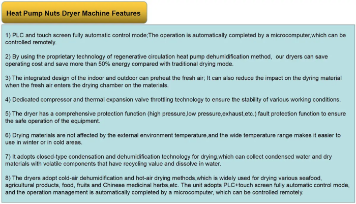 Integrated heat pump dehydration dryer for drying nuts: Walnut, almond, peanuts, pistachios, pecans, cashew, hazelnut, etc.
