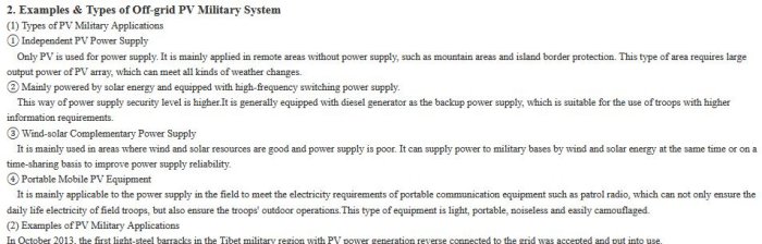 PV off-grid military system consists of PV module array, PV controller, control cabinet, battery, mounting bracket, cable and other equipment. Wind turbines, high-frequency switching power supply and oil-fired generators can be selected according to the field environment to ensure the power supply operation of military units in extreme weather.