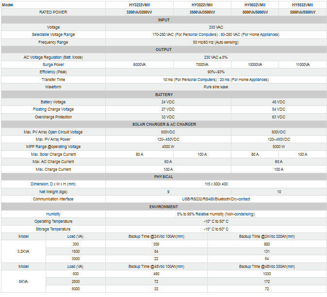 High efficiency pure sine wave inverter(PF=1);Wide PV input range (120Vdc-500Vdc) 80A MPPT SCC; Intelligent 3 stage 60A AC battery charger.