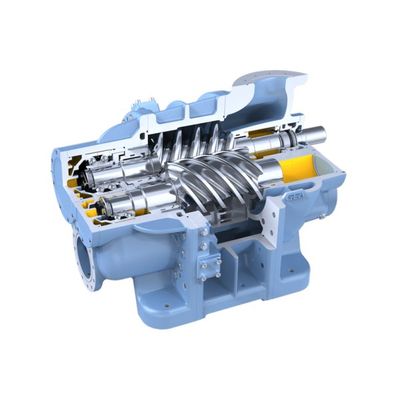 Twin screw shaped meshing rotors are mounted in a figure of eight shaped housing, which has suction and discharge ports at either end. As the rotors turn they form a space that traps gas, the space travels down the length of the housing, and because of the profile of the screws, is compressed as it goes. Oil is flood injected into the compression space to lubricate the bearings and screws, and to absorb the heat of compression. The oil and compressed gas mixture subsequently passes into a de-oiling vessel. The oil is then cooled and filtered and goes back round the cycle once again.