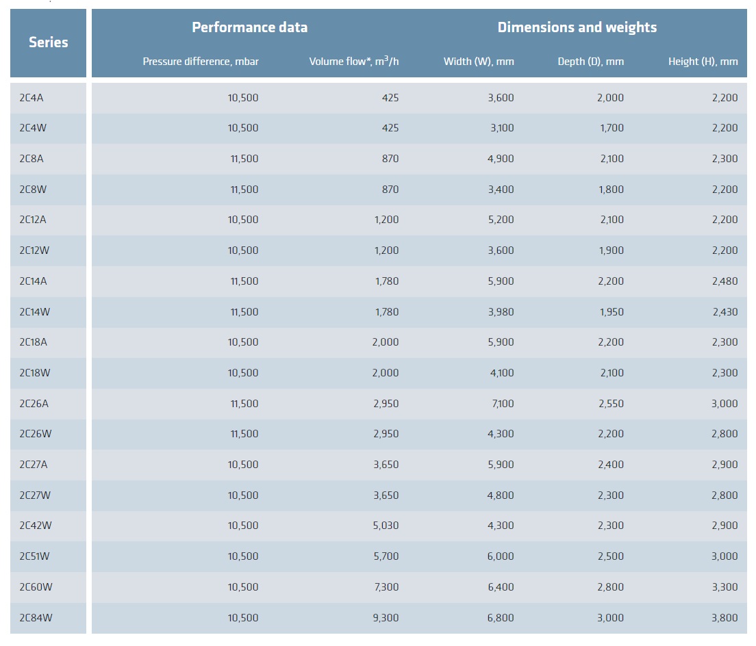 - Volume flow: 166 to 9,300 m3/h