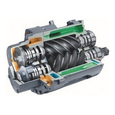 Twin screw shaped meshing rotors are mounted in a figure of eight shaped housing, which has suction and discharge ports at either end. As the rotors turn they form a space that traps gas, the space travels down the length of the housing, and because of the profile of the screws, is compressed as it goes. Due to no lubricant in the compression space, timing gears are employed to ensure that the two rotors do not touch.
