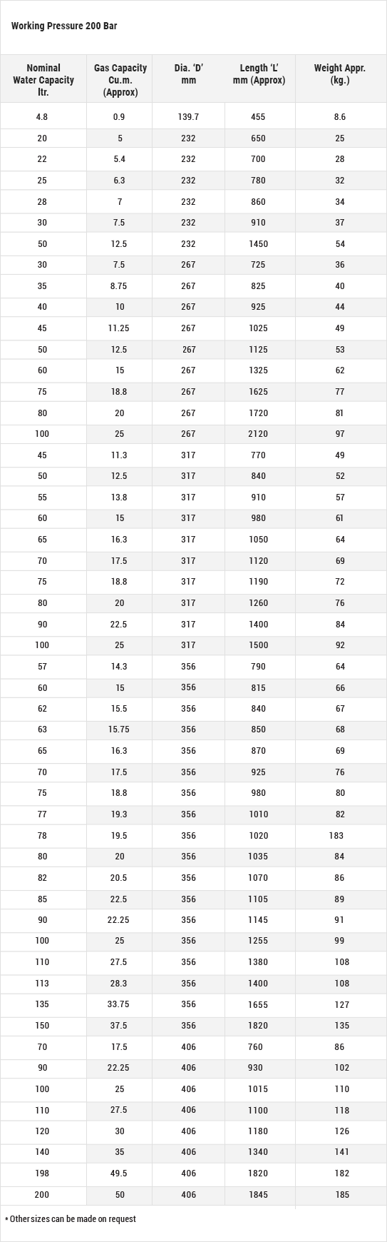 We are manufacturing Type-1 CNG cylinders for On Board application. The extensive research indicates that CNG cylinders provide safe and reliable fuel storage on a vehicle when installed, protected and maintained properly. Owners or operators are strongly recommended to implement practices within their fleets to ensure that CNG cylinders provide safe operation throughout the life of the vehicle. Natural gas vehicles with CNG cylinders should be periodically subjected to either a generic or in-depth inspection to assess its condition for uninterrupted service. Different countries around the world have different norms for the re-assessment of cylinders periodically. The cylinders are designed to sustain a filling pressure of 200 bars. The cylinders are available with a range from 20Ltr. to 200Ltr. in different diameters. The CNG cylinders are available in manufacturing standard such as IS15490, ISO11439,NZS5454, ECE R110.