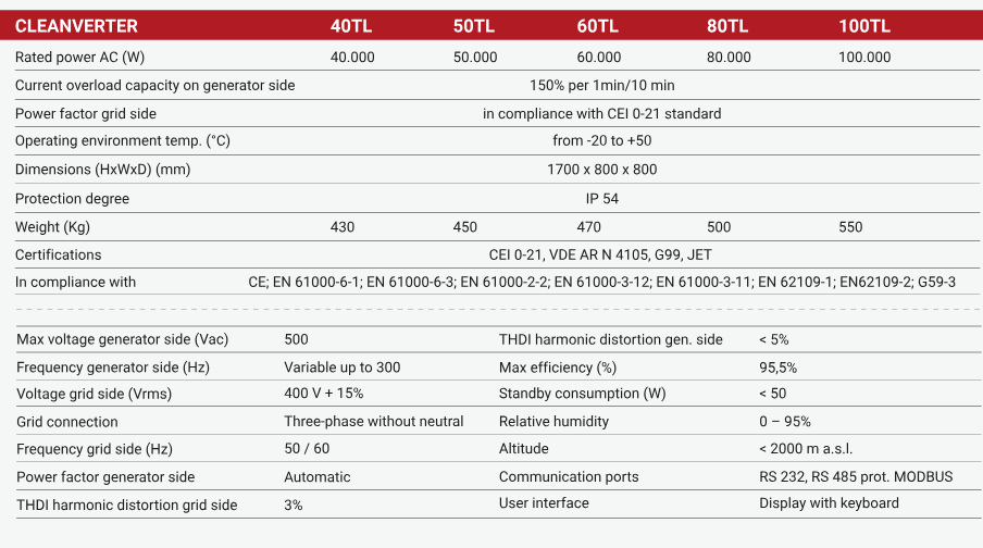 Inverters in the CLEANVERTER 40-100 TL series have been designed specifically for grid connection of variable-speed renewable source power plants using a permanent magnet synchronous generator or excited synchronous or asynchronous. CLEANVERTER 40-100 TL is a comprehensive system built in an cabinet for outdoor installation without transformer, with a double (back to back) inverter configuration with DSP (Digital Signal Processor) digital control meaning the electrical generator is managed as effectively as possible.