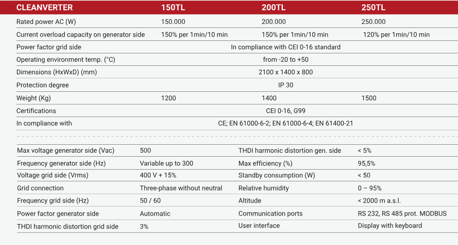 Inverters in the CLEANVERTER 150-250 TL series have been designed specifically for grid connection of variable-speed renewable source power plants using a permanent magnet synchronous generator or excited synchronous or asynchronous. CLEANVERTER 150-250 TL is a comprehensive system built in an cabinet for indoor installation without transformer, with a double ( back to back) inverter configuration with DSP (Digital Signal Processor) digital control meaning the electrical generator is managed as effectively as possible.