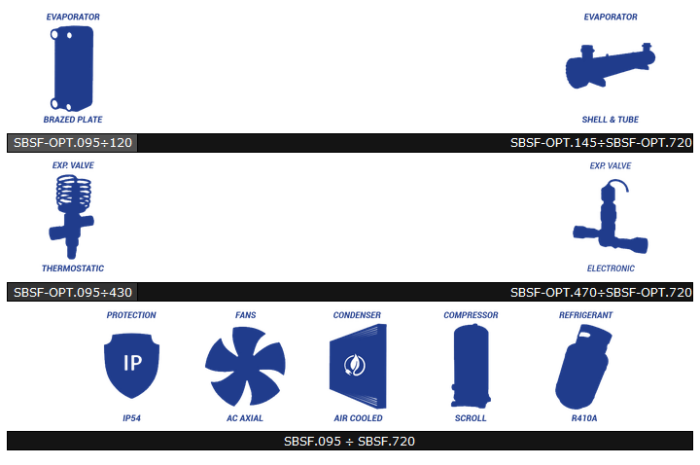 Standard Configuration: Compressors: Scroll. Condenser: Air-Cooled with integrated and optimized Free-Cooling coils, with copper tubes and aluminum finned core. Evaporator: Brazed plate (SBSF-OPT.095÷SBSF-OPT.120) or Shell & Tube (SBSF-OPT.145÷SBSF-OPT.720). Expansion Valve: Thermostatic (SBSF-OPT.095÷SBSF-OPT.430) or Electronic (SBSF-OPT.470÷SBSF-OPT.720). Fans: AC axial. Protection Rating: IP54. Refrigerant: R410A, R454B; R32. Cooling Capacity Range 99kW ÷ 706kW.