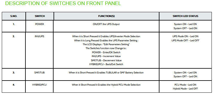 - Indications for Mains ON, UPS ON, Battery Low, Charging/Discharging, Over Load, Short Circuit, Thermal Trip on LCD Display User-Friendly LCD for the display of mode of operation and all parameters