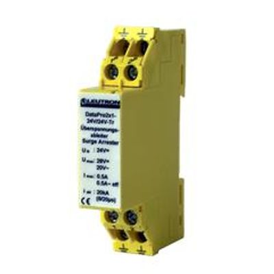 Nearly leakage current free overvoltage protection device for 2-data or signal lines, 2-wire bus networks. Coarse protection by 20kA (8/20μs) heavy duty-GDT. Fine protection by high speed suppressor-diodes. Low-pass filter characteristic against danger high frequent harmonics. Transversal and longitudinal voltage protection. Rigid and small size polycarbonate housing for DIN-rail or direct mounting. Strong and corrosion resistant universal screw terminals.