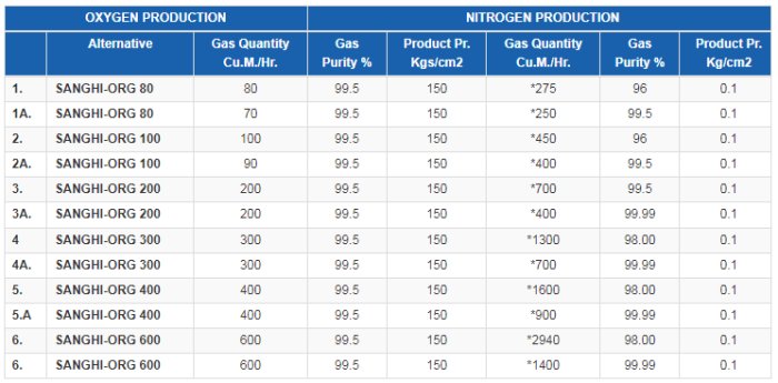 The above product capacities are based on ambient conditions of 15oC temperature 760mm of Hg pressure and 50% relative humidity and 0.03% of Carbon Di-oxide is allowed as impurity.