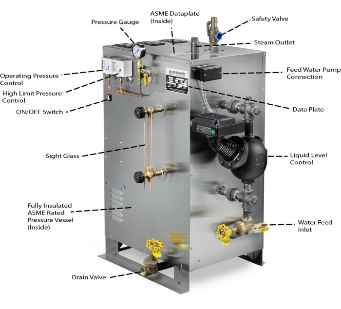 Suitable for industries requiring efficient, high quality saturated steam, including laboratories, hospitals, industrial plants, pilot plants, food and chemical processing applications. These versatile generators are perfect for aImost any application requiring steam from 0-100 PSIG. Each unit is complete with automatic features, including pressure and liquid level controllers, ASME Code pressure vessel and safety valve and are fully tested under power. Each one must pass Sussman’s rigid quality control inspection before it is shipped. Sussman Electric Boilers - your source for fast economical steam energy.