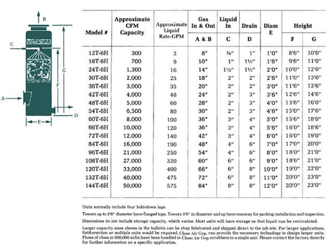 Dimensions And Approximate Sizing: The overall dimensions shown in the table are based on a typical application of 1% HCI in an air stream with a 99% removal required. The dimensions given are for a fiberglass tower with typical nominal 2″ Spiral-Pac and a standard mesh type mist eliminator.