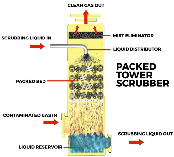 Packed Tower Gas Absorber: The Clean Air Group, LLC Packed Tower Gas Absorber utilizes a vertical counter-current design for highly efficient absorption of a variety of toxic gases. In addition to its extensive uses in air pollution control, the Packed Tower can serve as a gas/liquid contactor in a number of process applications. Efficiencies of 99.9% and greater are not unusual for many scrubbing applications.