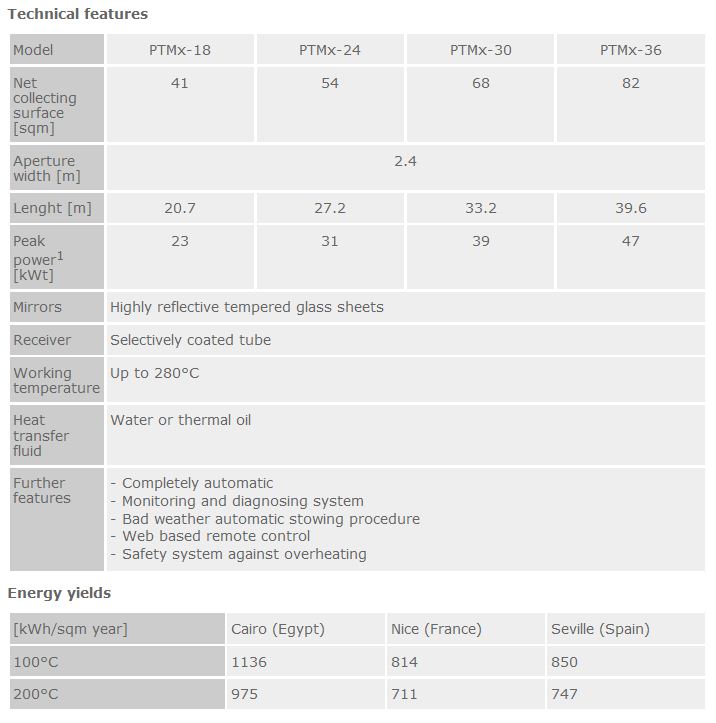PTMx is available in four basic models of different size, that can be combined in order to realize customized solar fields, starting from few hundred square meters of collecting surface.