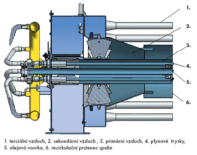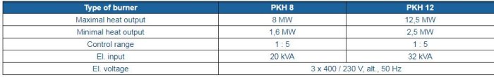PKH is combined industrial burner for burning of gaseous and liquid fuels, designed as one design complex (monoblock). FD fan with noise silencer is located directly on the burner; if required, the fan can be separated and located independently, or common fan for more burners can be used. Burners are designed for the burning of natural gas up to the inlet overpressure 50 kPa. Further, also heavy gas oil (LTO) or mazut, which are sprayed as pressurized or by steam.Burner enables continuous control of heat output, whereas electronic link from the control automation maintains the correct ratio between fuel and air. Air quantity control by means of frequency converter guarantees maximal utilization of used electric power. Stack loss of consumers is minimized by low air excess in burning, which can be further optimized by means of oxygen probe.