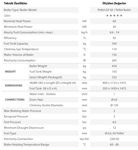 Modulation combustion. Full automatic cleaning burning pot. Digital control panel multi language LCD panel. Auto ignition. Manual cleaning turbulators. Efficiently burning by powerfull extractors. Chrono (weekly) programing. Back flame safety. Room thermostad connection .