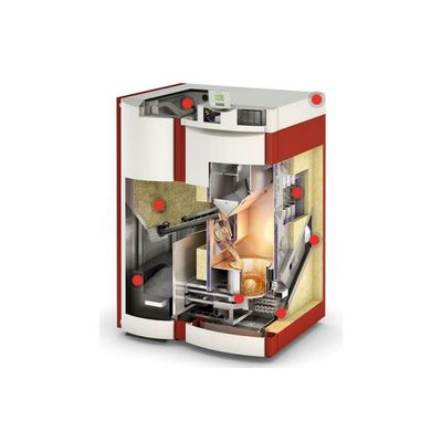 Well-designed to the smallest detail; Compact design; Space-saving floor space of only 1.12 m2. Heating surface cleaning; Long cleaning intervals thanks to fully-automatic heating surface cleaning. Ash box; Integrated ash box ensures long emptying intervals (1-3 times a year). Double ignition element;  Zero-wear, long-life double ignition element ensures high operational safety and low maintenance costs.