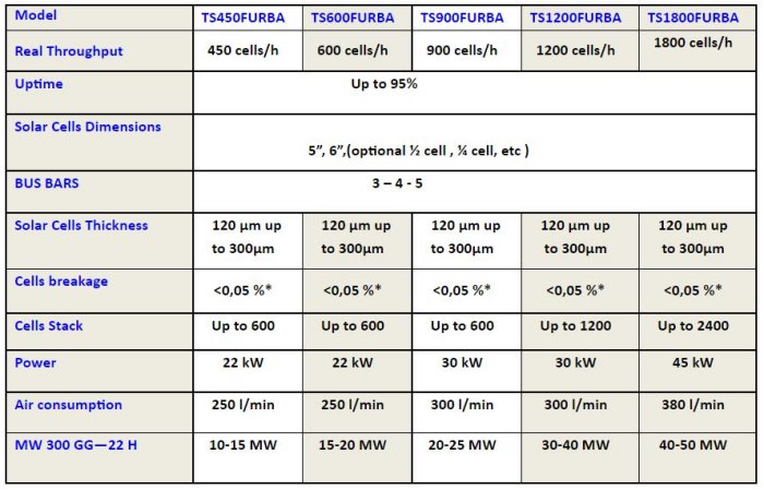 The new Combined Tabber-Stringer machines of the FURBA series are the result of 15 years of constant development in the field of photovoltaic technology. The new CTS FURBA series is composed by: TS450FURBA, TS600FURBA, TS900FURBA, TS1200FURBA, TS1800FURBA.