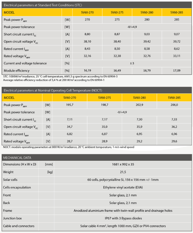 Power output range: 270-285 Wp. Dimensions (H x W x D) (mm): 1681 x 992 x 35. Module efficiency: 17,09%.