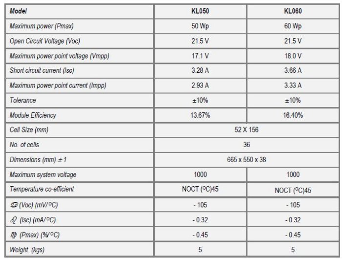 KL Solar - Model KL050 / KL060 -Photovoltaic Modules