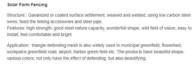 Solar Plastic Dipped Fence. Starwin solar is one of solar racking system manufacturers in China. solar fence can provide protection for the solar system, and the general ground solar system will be equipped with a protective fence. Fence can be mounted on two different foundation: Concrete foundation and Screw foundation. Solar fence is made by the surface treatment: plastic dipping with great quality. The surface treatment of fence is plastic dipping, high corrosion resistance guarantees the maximum possible lifespan and is also completely recyclable.