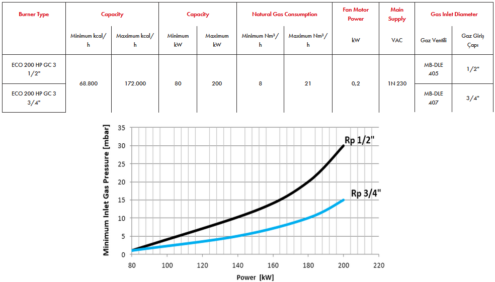 Modulating operation, Mechanical, pneumatic or electronic modulating control option, Natural gas and LPG fuel usage, Operating possibility of 300 mbar and 21 mbar gas pressure, Wide thermal capacity range according to heat demand, Supply gas pressure control with minimum gas pressure switch, Combustion air control with air pressure switch, Sliding flange for different boiler types, Working at low noise levels with light aluminum alloy body.