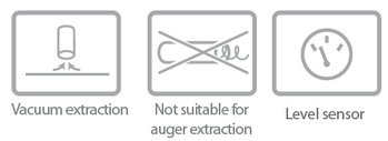 Maximum suction distance: 20 m horizontal and 6 m vertical. Automatic transport (pellet and cores). Storage tank with 13 litres capacity (8 kg). Time-based programming or continuous operation. Enables the control of a screw discharge system. Integrates a capacitive sensor. 1,600 W capacity.