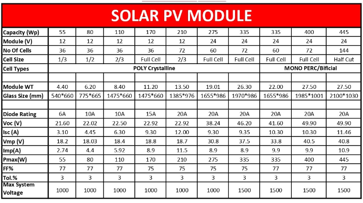 - Manufacturing complete range of Solar PV Module- Ranging from 40wp- 400wp.