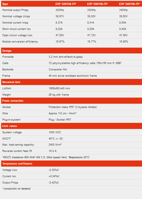 PV high-performance modules 72 cells. Guaranteed positive output tolerance of 0... +5Wp by single measuring. Maximum 2400Pa snow load. Maximum stability through aluminium frame Soft Grip. High-quality junction box and connector systems. Power 310W - 320W - 330W. 15 years manufacturer`s warranty. 25 years linear performance guarantee.