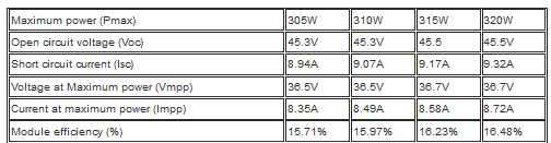 Soalr cell 156*156mm. No.of cells 72 pcs ( 6*12 ). Dimensions 1956*992*40mm. Weight 23.0kg. Front Glass 3.2mm tempered glass. Frame Anodized aluminium alloy. Junction Box IP65/IP75 rated (3 bypass diodes). Connectors MC 4 compatible. Mechanical load test 5400Pa. Operating module temperature -4℃ to + 85℃. Maximum system voltage 1500V DC (IEC)/600VDC (UL). Maximum series fuse rating 15A. Power tolerance 0/+5W.