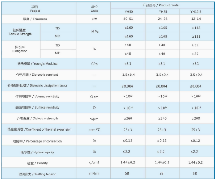 Polyimide film is one of industrialized polymers with highest operating temperature, whose long-term operating temperature can cover 200-380°C. As our main product, biaxially oriented polyimide film is also featured with good dimensional stability and high strength, in addition to traditional thermal and insulating performance.