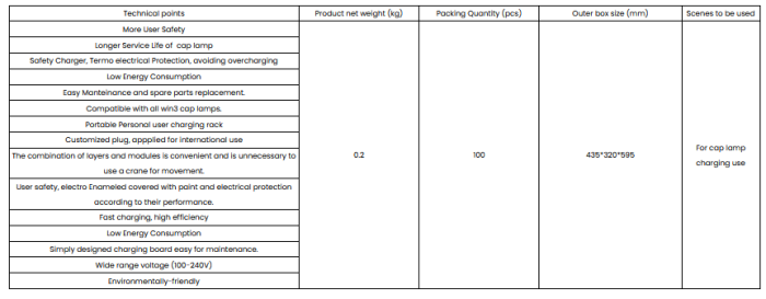 Features: Win3 portable unit cap lamp charger is specifically designed for Win3 series lamps with LiIon batteries, safe, faster charging, low energy cosumption.
