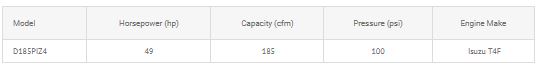 Built with the contractor in mind, this 185 cfm compressor is a reliable ally on any job site. Providing 185 cfm at 100 psi, this machine is ideal for powering pneumatic tools and sandblasting. Our 185 cfm Tier 4 Final compressor includes two full length tool boxes, two large service doors, and galvanized inner fenders. For scratch and rust protection, the exterior of the machine is up-fitted with Galvanneal and powder coated sheet metal. Powered by a 49 hp diesel engine, this design has two stage air filter and large 29 gallon fuel tank for full shift duties.